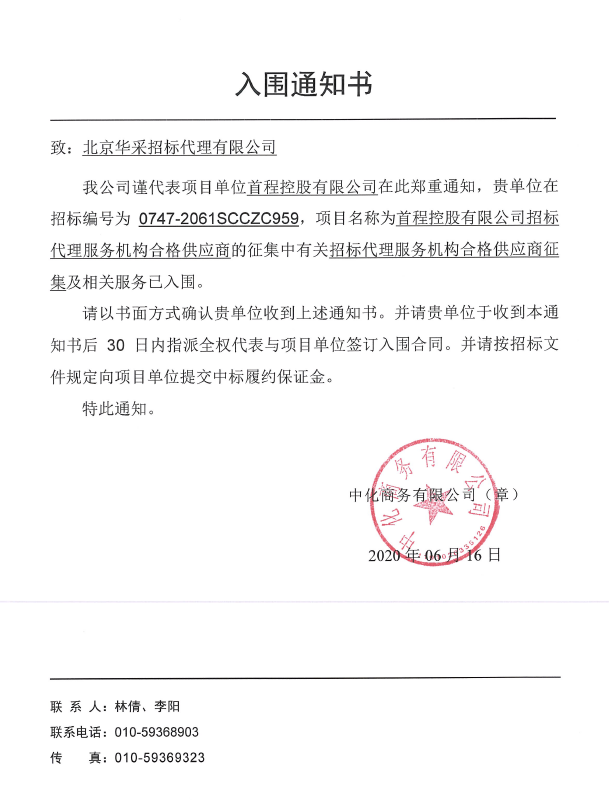 北京華采招標(biāo)代理有限公司成功入圍首程控股有限公司招標(biāo)代理機(jī)構(gòu)